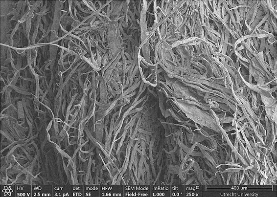 Imagem de microscopia eletrônica de varredura (MEV) da superfície da amostra de papel.
