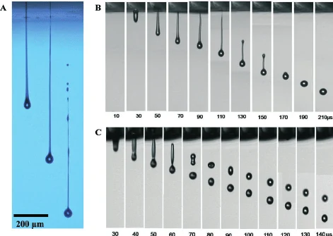 Gotículas satélites na impressão a jato de tinta. A: Imagem fotográfica de alta velocidade mostrando três gotas ejetadas de uma impressora DOD em diferentes estágios de formação. Da esquerda para a direita: a gota se forma a partir de uma única coluna de líquido ejetada que rapidamente forma uma gota principal seguida por um filamento. A cauda se fragmenta em um rastro de gotículas satélites atrás da gota principal. © IOP Publishing.