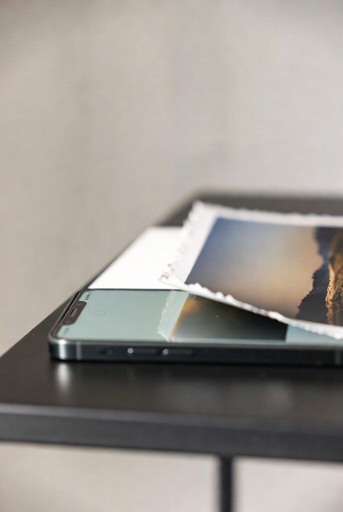 Papéis fine art têm um comportamento visual que o brilho do celular não entrega. Eles criam textura, absorvem luz de forma mais elegante, e fazem a imagem parecer mais orgânica. A fotografia deixa de parecer “uma tela” e passa a parecer um objeto artístico.