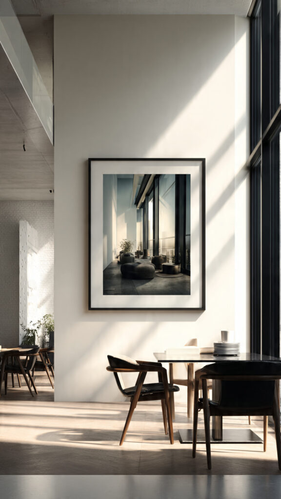 Uma obra impressa tem dimensão real. Ela interage com arquitetura, iluminação e distância de observação. Isso cria impacto espacial — algo impossível de replicar em tela.