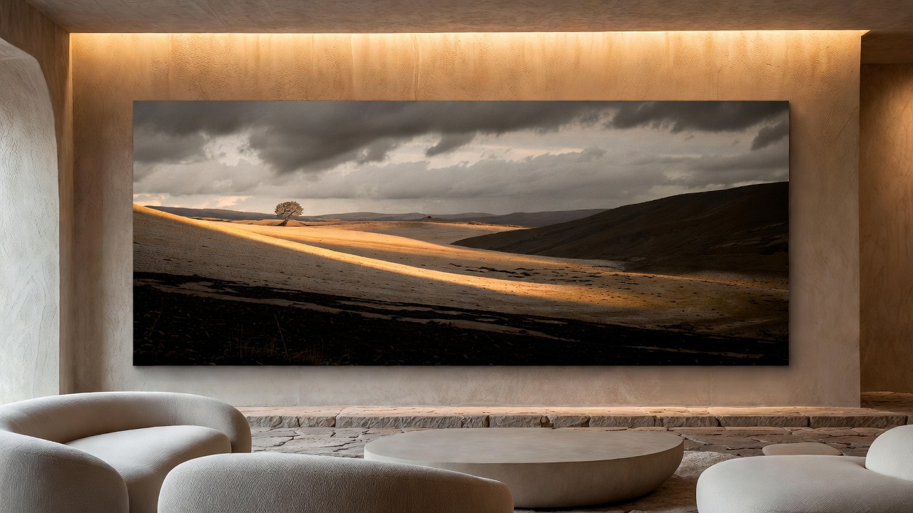 Isso altera completamente a percepção da obra no ambiente. A fotografia impressa em algodão dialoga com arquitetura orgânica, interiores com madeira, tecidos naturais, iluminação quente. Existe uma coerência estética com o movimento contemporâneo de ambientes mais acolhedores e sensoriais.